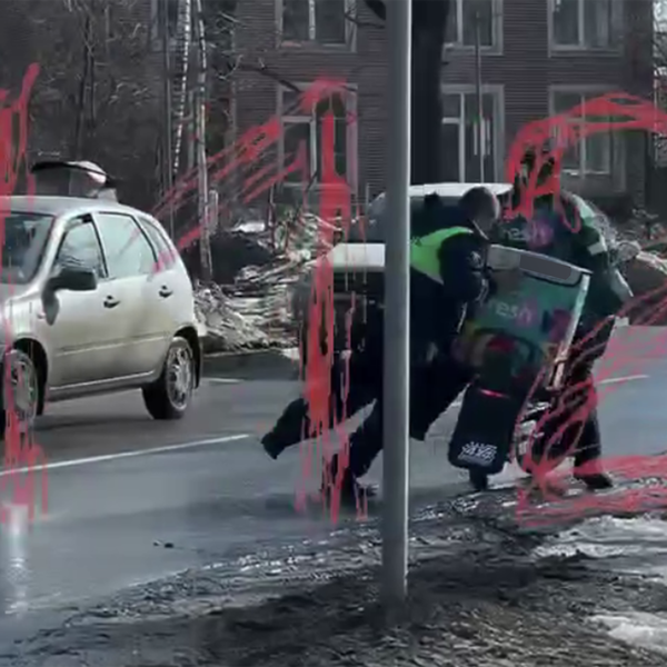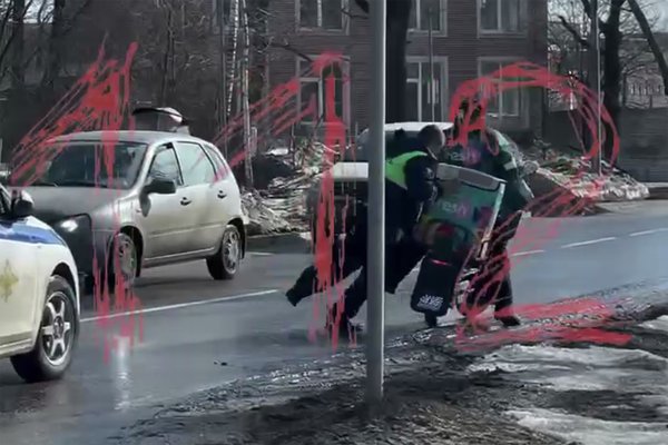 Очевидцы запечатлели инцидент на видео. На кадрах видно, как нарушитель пытается скрыться от сотрудников ГИБДД, но гаишник оперативно задерживает курьера.