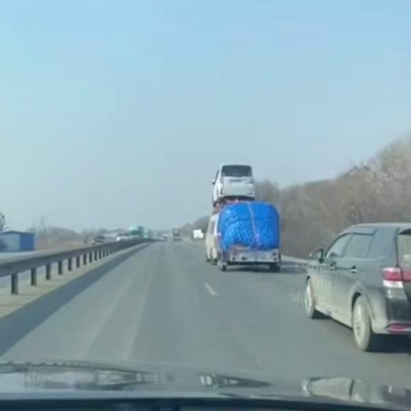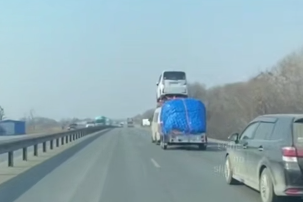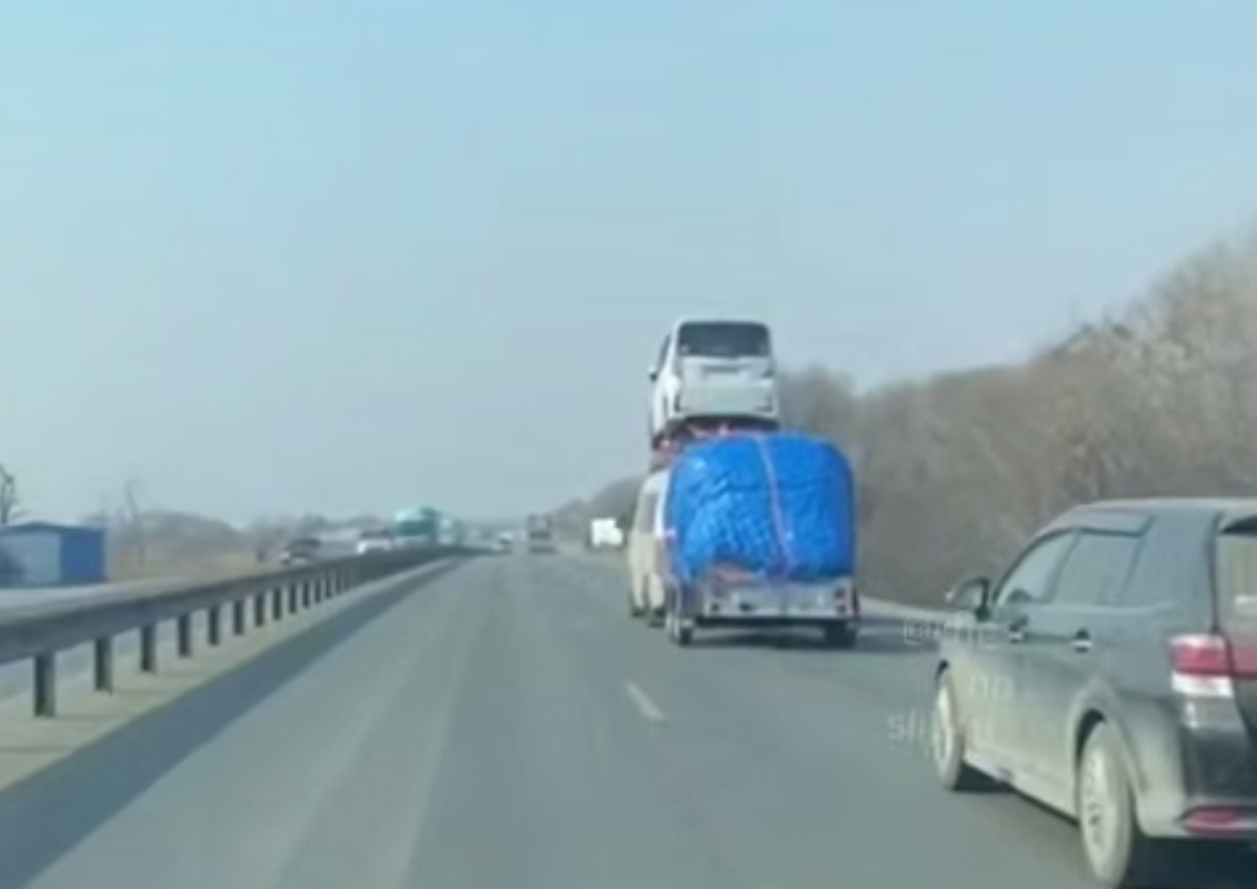 В посте уточняется, что машины сняли на трассе в районе села Кипарисово. На кадрах по дороге едет серый микроавтобус с грузом на прицепе. К крыше транспортного средства при помощи тросов привязан белый автомобиль меньшего размера.