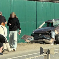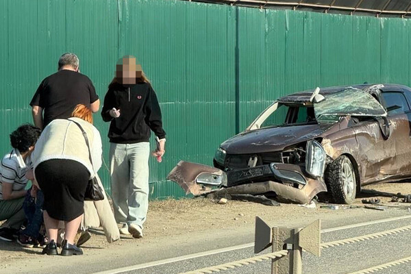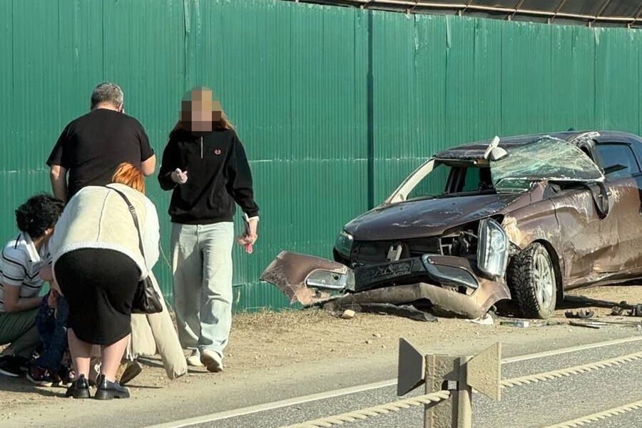 На кадрах с места аварии видно, что на обочине дороги стоит поврежденный автомобиль: у транспорта смят кузов, разбит капот, бампер и стекла, а его детали разлетелись по проезжей части. На фото также заметно, что на месте столкновения собрались люди.