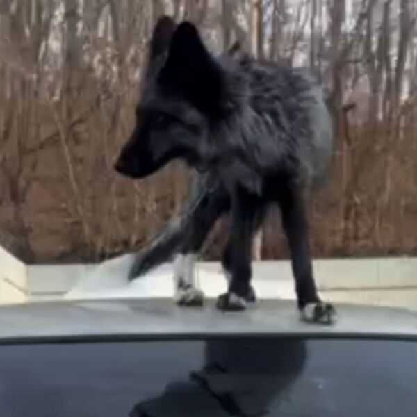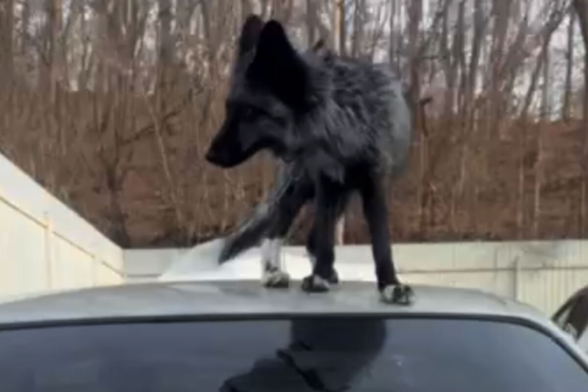 Местные жители запечатлели инцидент. На кадрах видно, как черное животное ходит по крыше серой припаркованной машины. При этом на лисе — ошейник.