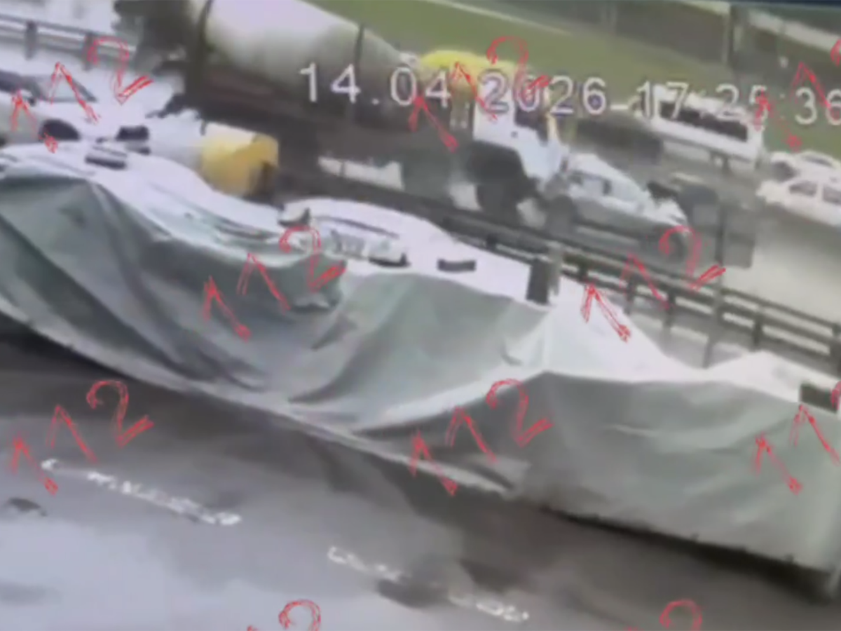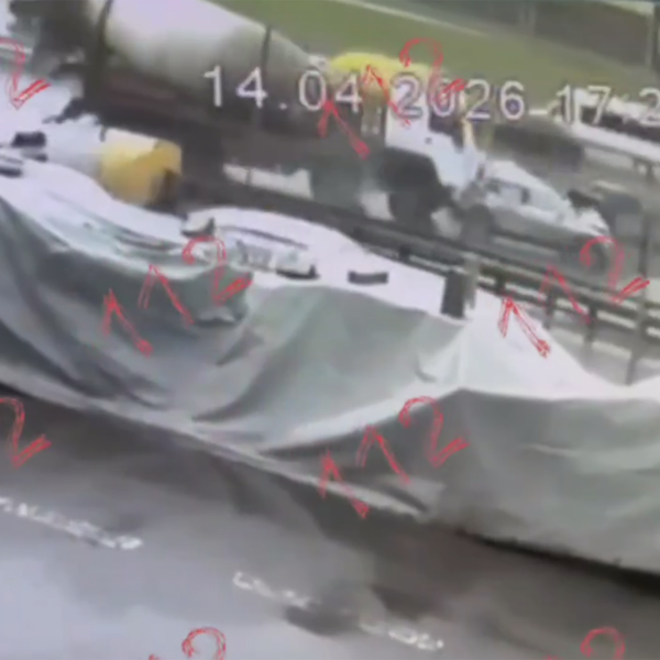 Уличная камера запечатлела инцидент. На кадрах видно, как бетономешалка на высокой скорости врезается в автомобили на проезжей части, после чего протаскивает их еще несколько метров.