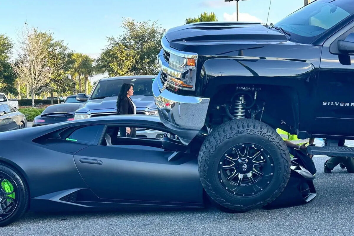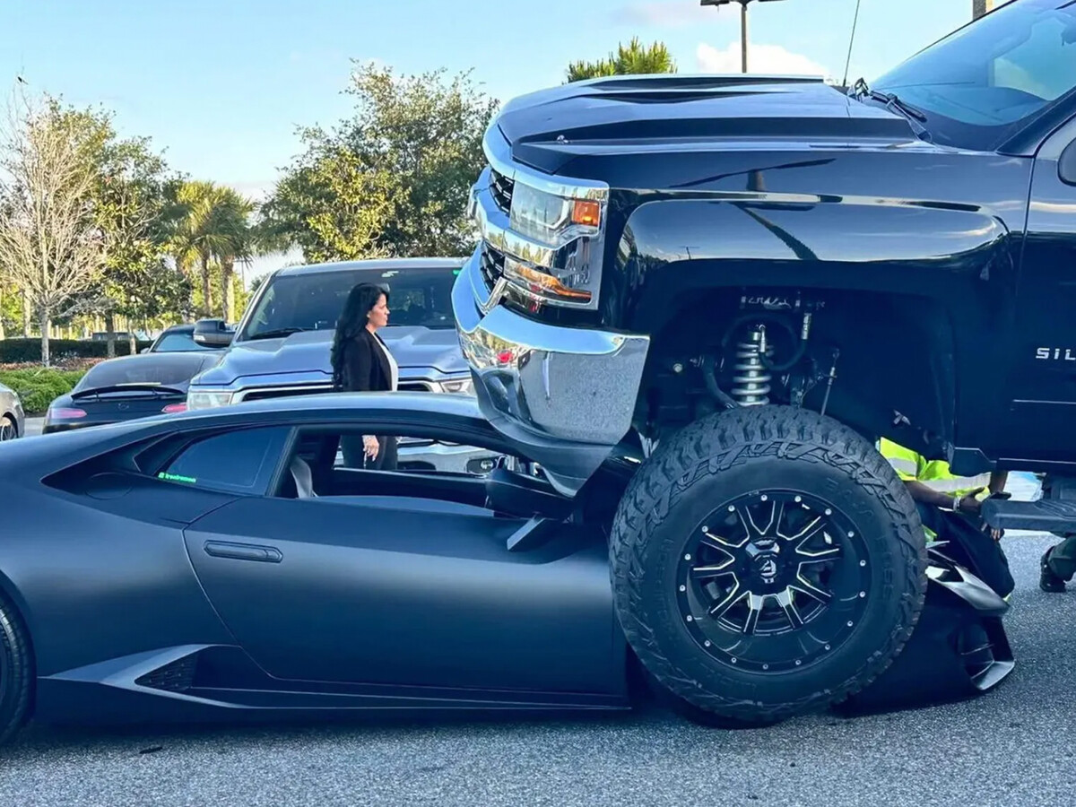 В американском штате Флорида женщина, находясь за рулем трехтонного пикапа Chevrolet Silverado с модифицированной подвеской и увеличенным дорожным просветом, переехала суперкар Lamborghini Huracan. Об этом сообщает Carscoops.
