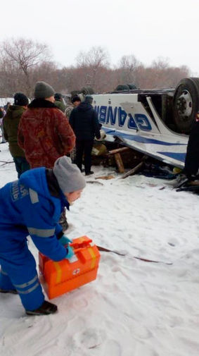 На месте ДТП с автобусом, упавшим в реку с моста на 60-м км автодороги Могойтуй - Сретенск - Олочи, 1 декабря 2019 года На месте ДТП с автобусом, упавшим в реку с моста на 60-м км автодороги Могойтуй - Сретенск - Олочи, 1 декабря 2019 года На месте ДТП с автобусом, упавшим в реку с моста на 60-м км автодороги Могойтуй - Сретенск - Олочи, 1 декабря 2019 года Бригада скорой помощи перекладывает на носилки пострадавшего, 1 декабря 2019 года Транспортировка пострадавших в машину скорой помощи, 1 декабря 2019 года Вертолет санитарной авиации авиакомпании Аэросервис, доставивший в Читу пострадавших в катастрофе, 1 декабря 2019 года