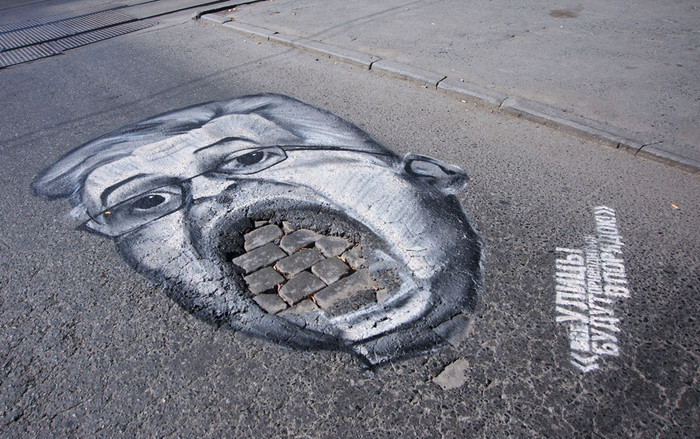 В Екатеринбурге анонимные художники нарисовали на дорогах города портреты региональных чиновников. В качестве элемента шаржа авторы использовали ямы и выбоины, которые визуально напоминают рот изображенных.