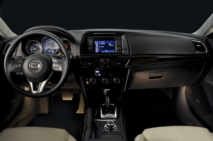 В местах частого прикосновения используются мягкие материалы. Это относится к декоративной отделке дверей и верхней части панели управления. В салоне много хромированных частей, выполненных «под металл». Mazda 6 также получила новую мультимедиа систему.