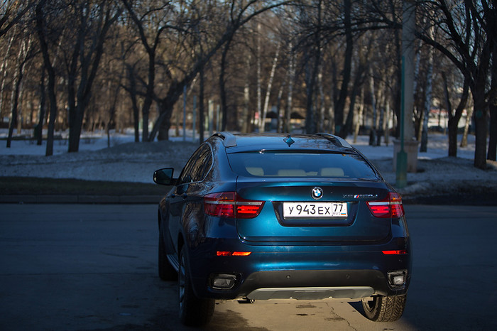 Впрочем, легким бездорожьем напугать вам X6 не удастся, и съехать с трассы на грунтовку или припарковаться в сугроб около подъезда вы сможете без проблем. Топливо «эмка» потребляла вполне умеренно, расход в смешанном цикле по показаниям бортового компьютера составил 13,5 литров, но если захочется немного «полихачить», прожорливость вполне может достичь 17 литров. Сзади автомобиль не претерпел особых изменений, но соседи по потоку, сразу поймут, что к чему завидя заветную букву «М» в аббревиатуре на крышке багажника. Если сзади сидят дети, то чтобы включить им мультики стоя в пробке, водителю придется отстегнуть ремень, встать на колени на сидение и пытаться нащупать жерло ДВД-плеера в такой вот интересной позе.