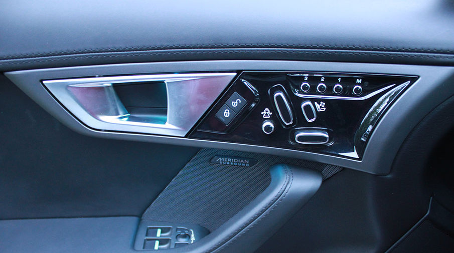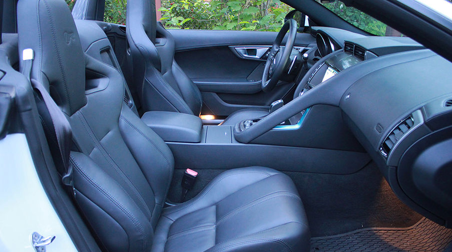 Можно назвать с десяток прилагательных, чтобы описать дизайн этого кабриолета. Но интереснее другое. Как правило, автомобили, даже с изысканным дизайном, лишь в некоторых ракурсах выглядит гармонично. Но вот F-type смотрится отлично, с какой стороны к нему не подойди. Крыша опускается даже на ходу (на скорости до 50 км/ч), а занимает процесс около 12 секунд. Так что капли дождя не успеют смыть пыль с лица и кожаной обивки салона. Дверные ручки, как на Aston Martin, автоматически убираются после начала движения, чтобы поток воздуха мог беспрепятственно проходит вдоль бортов кабриолета. В большинстве спортивных кабриолетов и родстеров чувствуешь себя килькой в бочке. Со стороны кажется, что в F-Type тоже тесновато. Но нет, свободного пространства, по крайней мере, у водителя здесь по ощущениям даже больше, даже чем в седане XF. Так называемого «воздушного шарфа» как на иных кабриолетах у F-Type нет. Зато есть дефлекторы, выдвигающиеся автоматически.