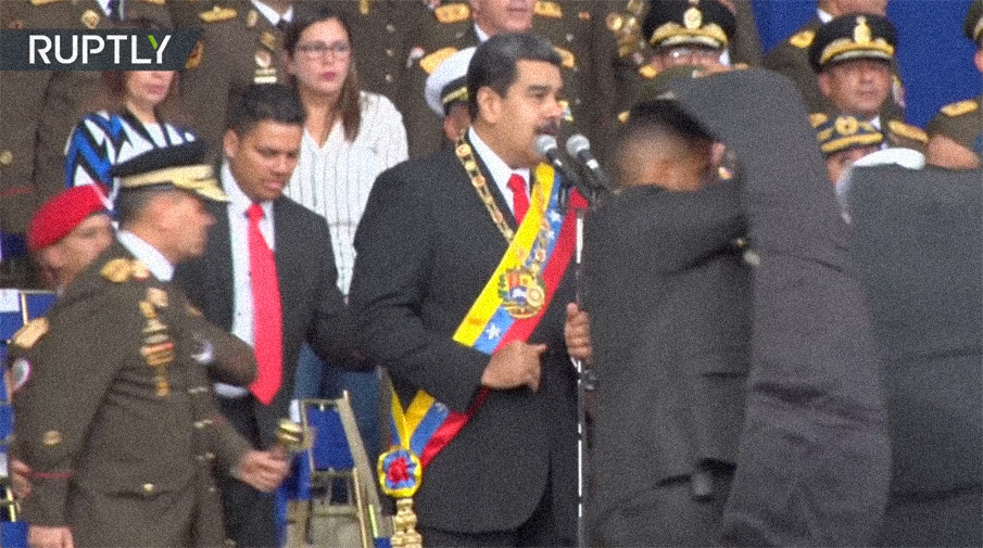 Охранники закрывают щитами президента Венесуэлы Николаса Мадуро