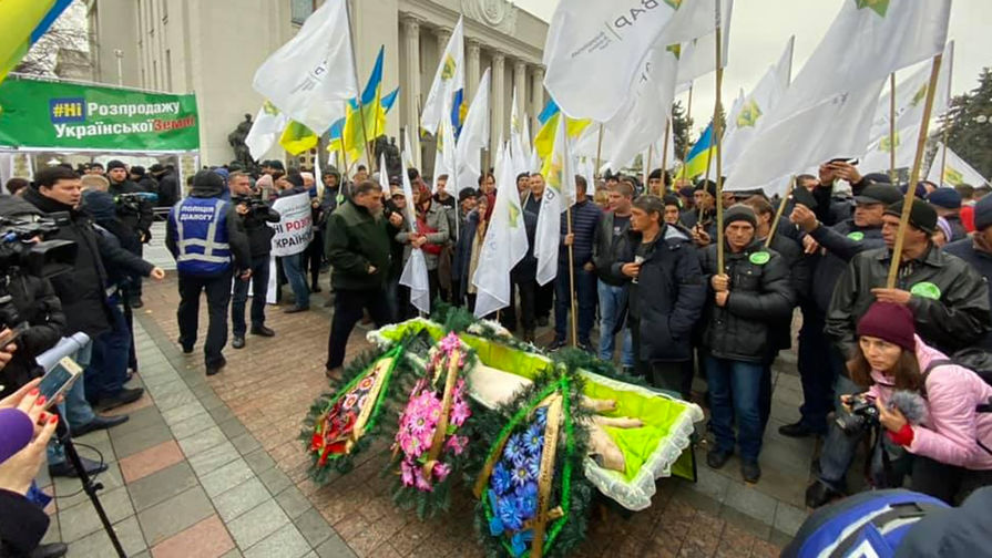Селяне, выступающие против снятия моратория на продажу земли, принесли к зданию Рады мертвую свинью в гробу. По словам протестующих, они планируют захоронить животное на площади Конституции в центре Киева.