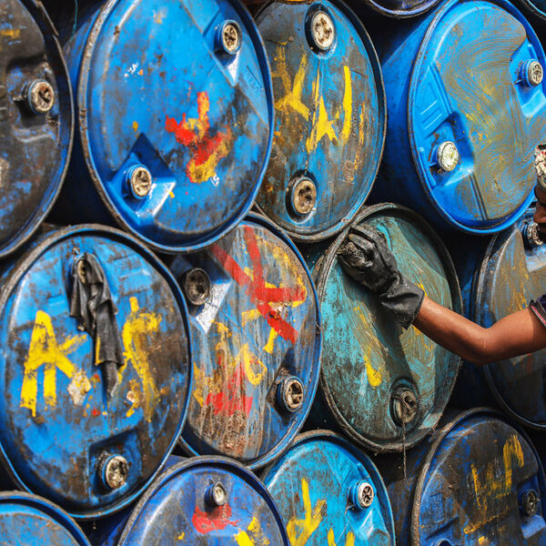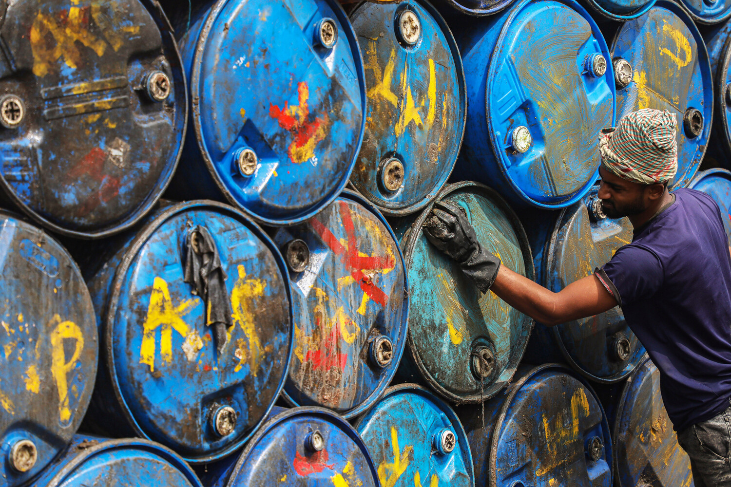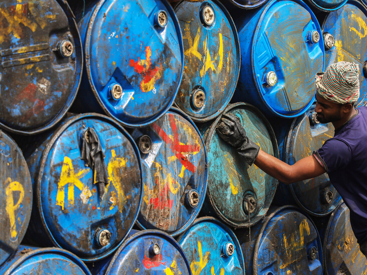 Рабочий отмывает резервуары для нефти в Дакке, Бангладеш