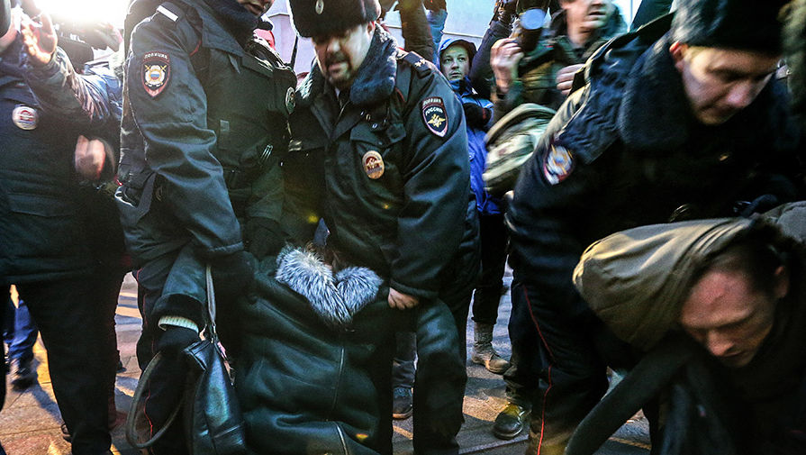 Сообщается, что полицейские занесли в один из автозаков женщину без сознания.