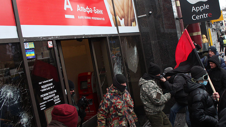 Митингующие в центре Киева разгромили отделение российского Альфа-банка, пишет «Апостроф».