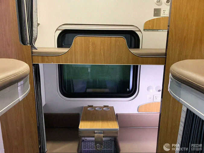 В нем появились индивидуальные столики для пассажиров верхних полок, а также шторки для каждого пассажира. Вагон выполнен в бежево-серых тонах, он вмешает 54 пассажира.