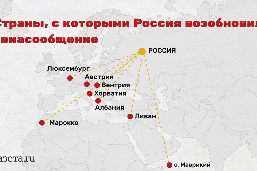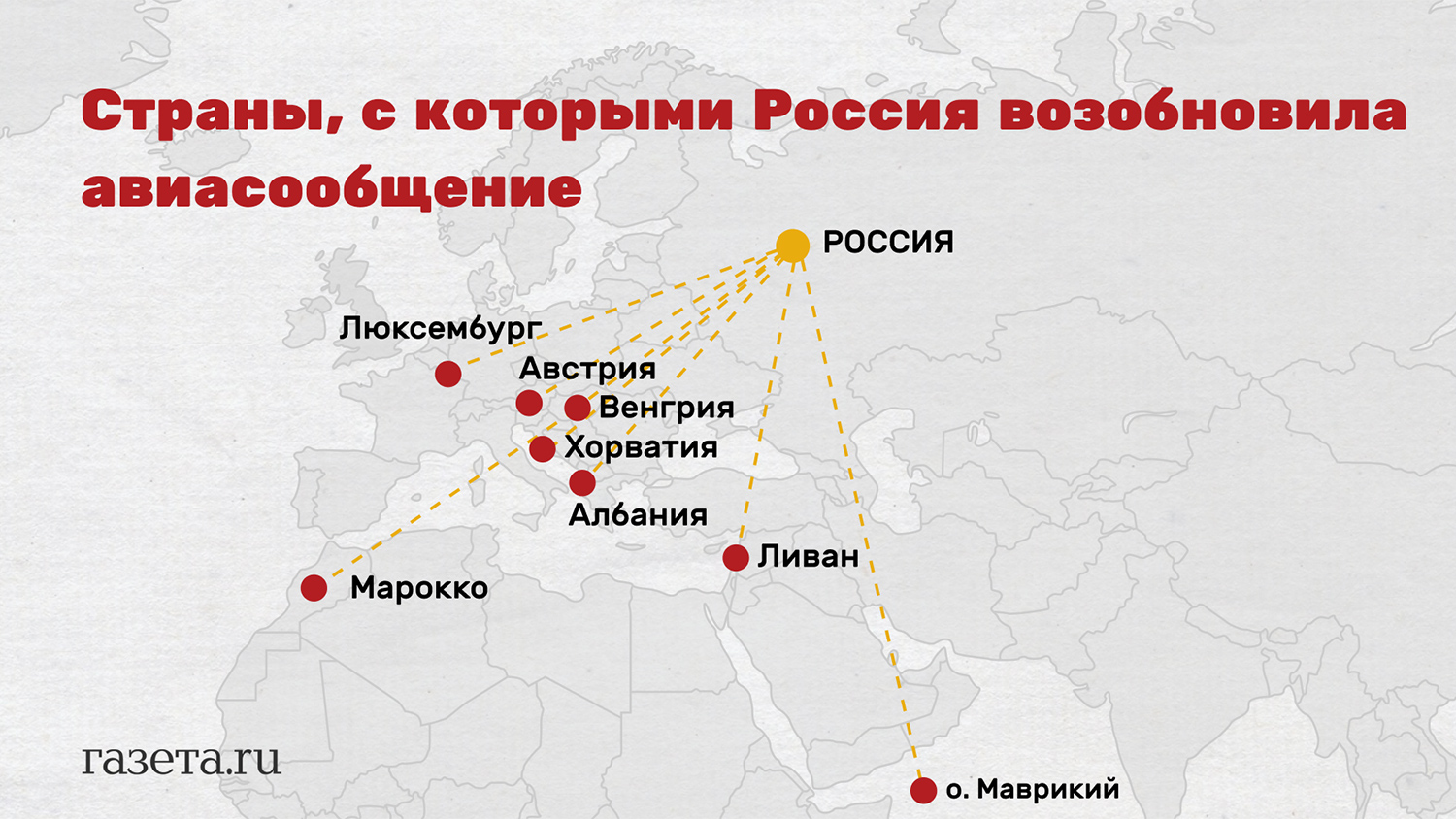 Россия с четверга, 10 июня, возобновляет регулярное авиасообщение с восемью странами. Среди них — Австрия, Венгрия, Ливан, Люксембург, Маврикий, Марокко, Хорватия. Кроме того, будут осуществляться чартерные полеты в Албанию. Решение о возобновлении рейсов в указанные страны ранее принял оперативный штаб по борьбе с коронавирусом, передает ТАСС.
