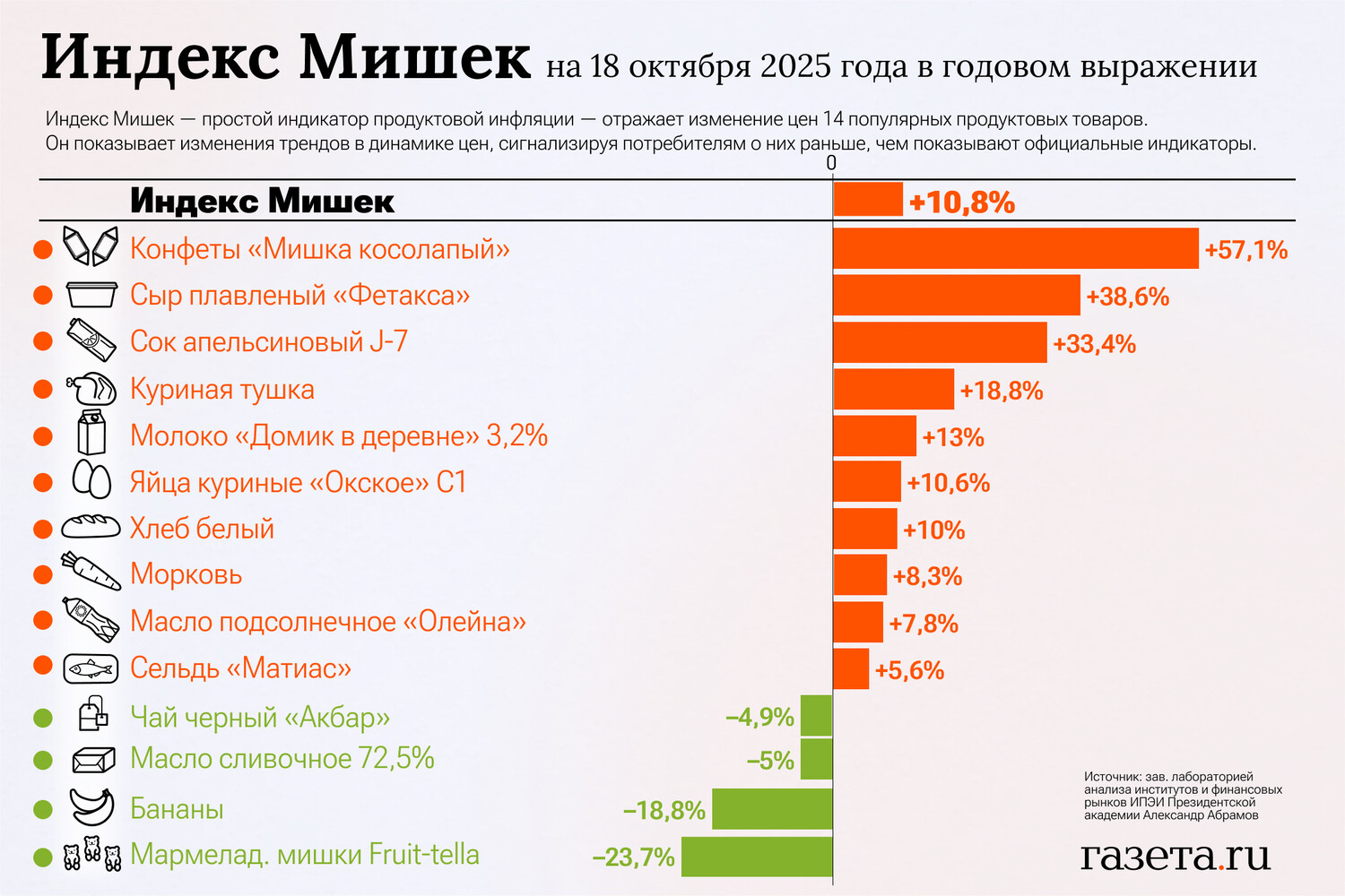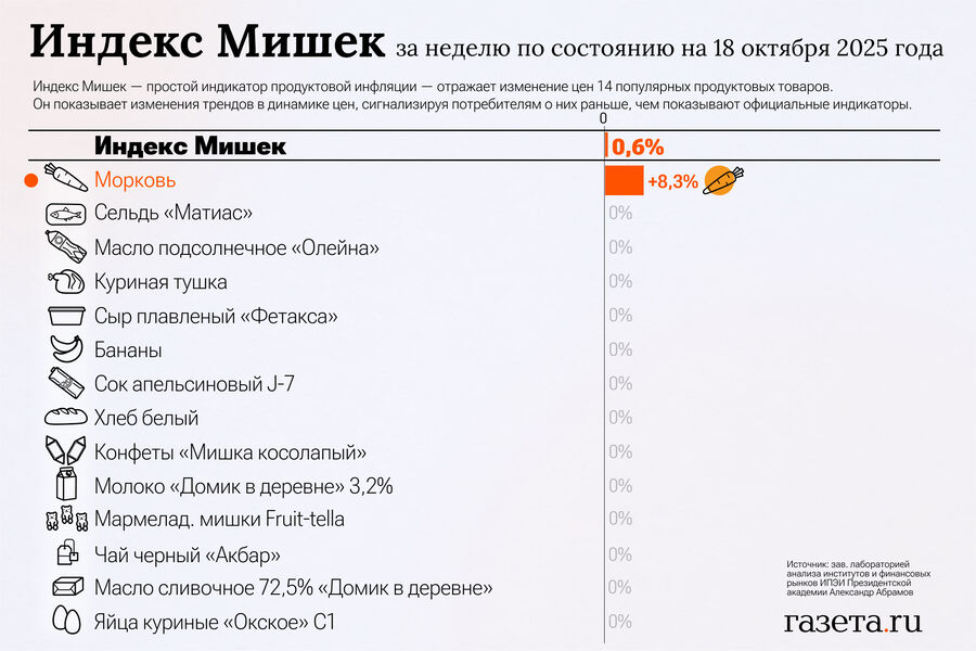 «За неделю значение Индекса Мишек выросло на 0,6% по сравнению с его ростом на 0,3% неделю назад. За неделю выросли цены лишь на морковь — на 8,3%. Цены остальных товаров не изменились. В годовом выражении значение Индекса Мишек увеличилось на 10,8% по сравнению с его повышением на 7,2% неделей ранее», — отметил Абрамов.