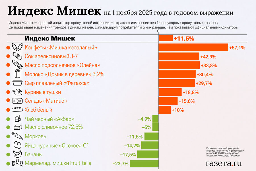 «За неделю значение Индекса Мишек выросло на 1,9% по сравнению с его снижением на 1,0% неделю назад. За неделю снизились цены на яйца «Окские» категории С1 (-17,6%) и на морковь (-4,2%). Выросли цены на подсолнечное масло «Олейна» (+24,1%), молоко «Домик в деревне» 3,2% жирности (+15,4%), апельсиновый сок J7 (+7,1%) и на бананы (+1,5%). Цены остальных товаров в индексе не изменились», — отметил Абрамов.