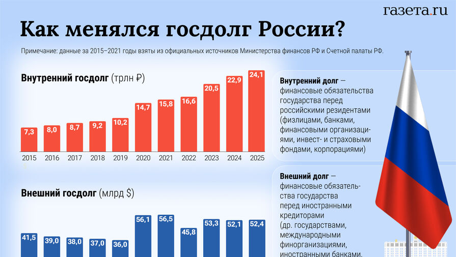 Что было бы в случае «долгового удушения» в России? По словам Трепольского, чтобы привлекать деньги для финансирования большого долга, государство вынуждено повышать ставки по своим облигациям. Это приводит к росту стоимости кредитов для населения (ипотека, потребительские кредиты) и бизнеса, сказал эксперт. Он добавил, что значительная часть бюджета уходит на обслуживание долга. Это означает, что меньше денег остается на образование, здравоохранение, инфраструктуру и пенсии, подчеркнул эксперт. По его мнению, в крайнем случае для обслуживания долга государство может начать денежную эмиссию (печатать деньги), что неизбежно ведет к ускорению инфляции и обесцениванию сбережений граждан. Трепольский заключил, что долговая нагрузка подрывает доверие инвесторов к экономике, и это снижает приток прямых иностранных инвестиций, а, значит, также создание новых рабочих мест и рост зарплат.