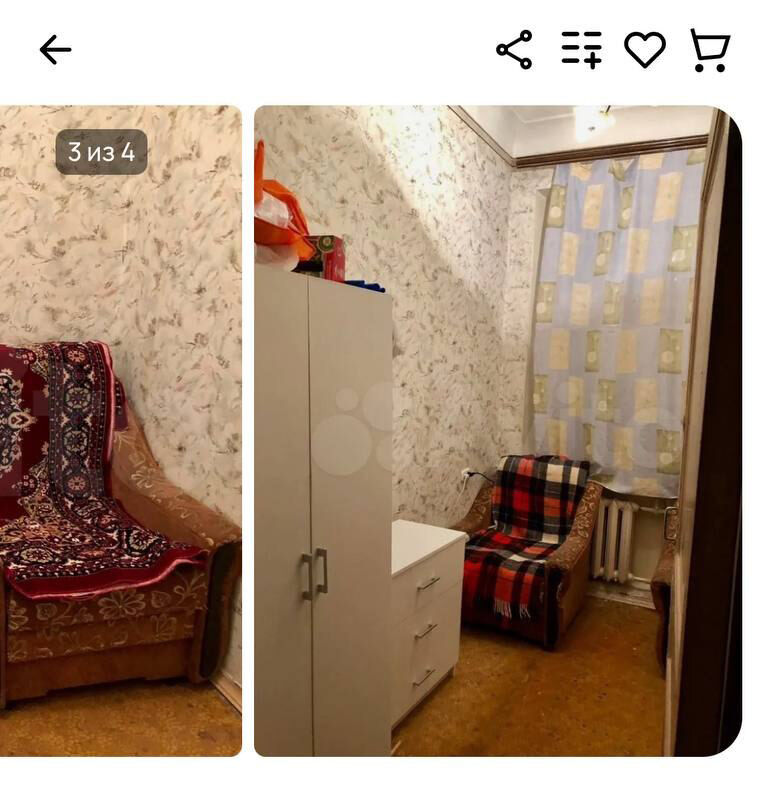 Третью позицию занимает комната площадью 8 кв. м в деревне Шпаньково Ленинградской области. Она продается за 630 тыс. рублей в трехкомнатной квартире. В объявлении указано, что одна комната закрыта, во второй проживает пара, санузел раздельный, требуется ремонт, собственность зарегистрирована более 10 лет, никто не прописан.