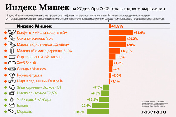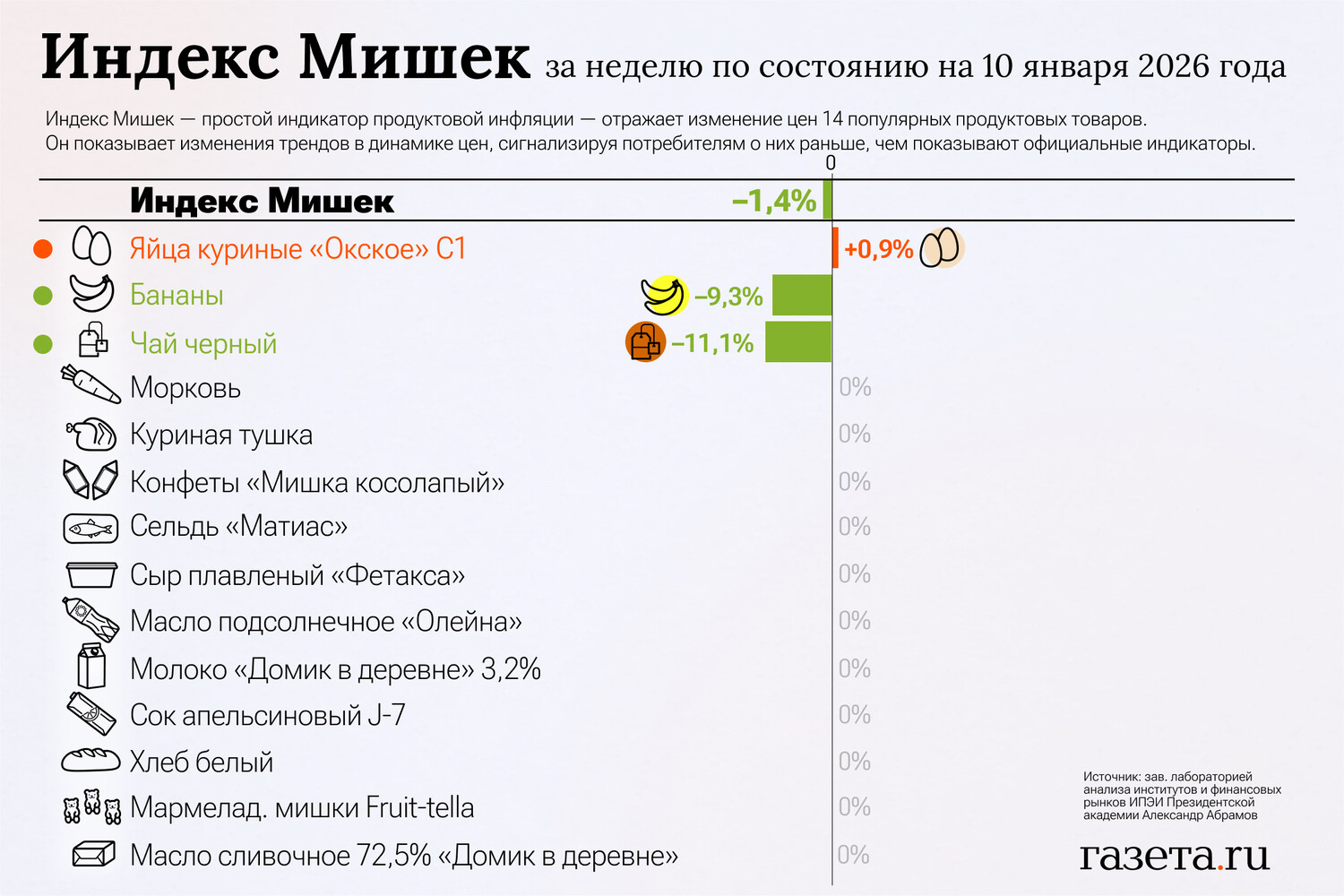 «За неделю значение Индекса Мишек снизилось на 1,4% по сравнению с его повышением на 0,2% неделю назад. За семь дней снизились цены на черный чай «Акбар» (-11,1%) и бананы (-9,3%). Подорожали яйца «Окские» категории С1 (+0,9%). Цены остальных товаров в индексе не изменились. В годовом выражении значение Индекса Мишек выросло на 1,8% по сравнению с его увеличением на 3,3% неделю назад», — отметил Абрамов.