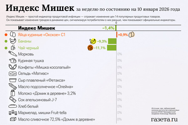 Черный чай в российских магазинах подешевел на 11,1% за неделю с 3 по 10 января 2026 года, бананы — на 9,3%. Об этом «Газете.Ru» рассказал создатель Индекса Мишек, заведующий лабораторией анализа институтов и финансовых рынков ИПЭИ Президентской академии Александр Абрамов.