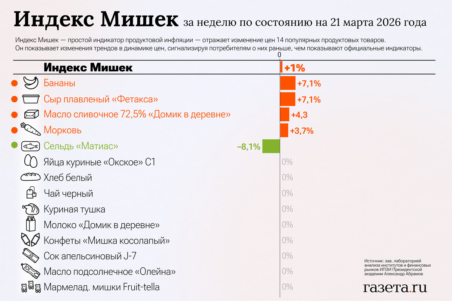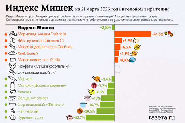 «За неделю с 14 по 21 марта значение Индекса Мишек выросло на 1,0% по сравнению с его увеличением на 0,6% неделю назад. За неделю снизились цены на сельдь «Матиас» (-8,1%). Повысились цены на бананы (+7,1%), плавленый сырный продукт «Фетакса» (+7,1%), сливочное масло (+4,3%) и морковь (+3,7%). Цены остальных товаров в индексе не изменились. В годовом выражении значение Индекса Мишек снизилось на 2,8% по состоянию на 21 марта по сравнению с его ростом на 0,3% неделю назад», — отметил Абрамов.