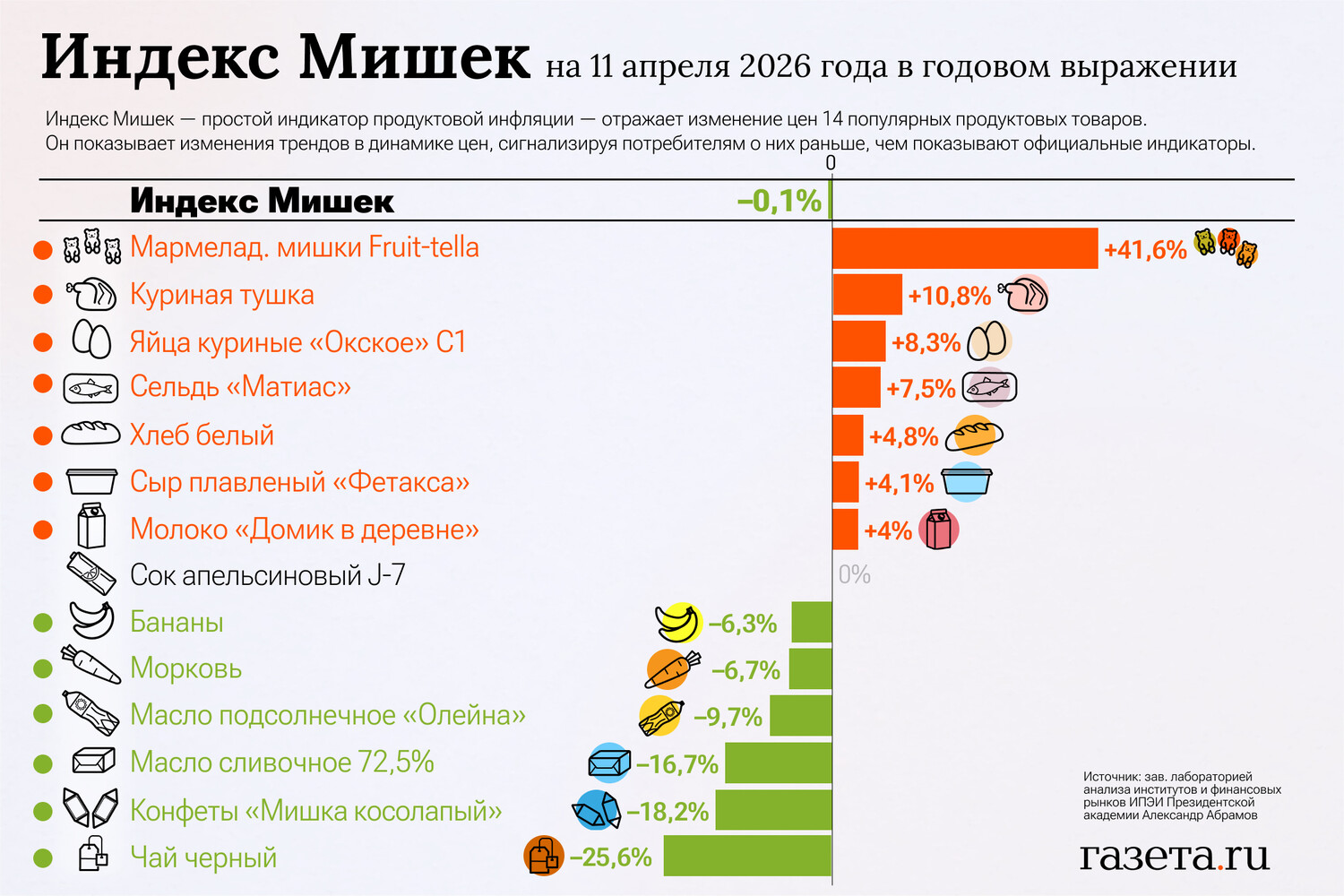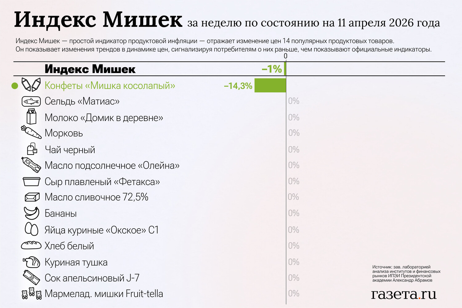 «Значение Индекса Мишек за неделю с 4 по 11 апреля снизилось на 1,0% по сравнению с его ростом на 2,5% неделю назад. За неделю подешевели конфеты «Мишка косолапый» (-14,3%). Цены остальных товаров в индексе не изменились. В годовом выражении значение Индекса Мишек уменьшилось на 0,1% по данным на 11 апреля по сравнению с его ростом на 2,3% неделю назад», — отметил Абрамов.