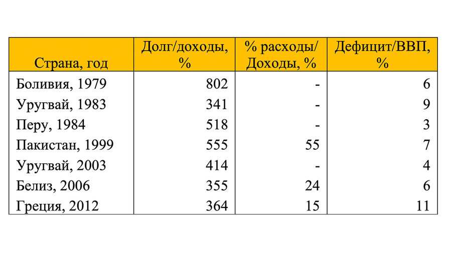 Таблица. Показатели стран перед дефолтами, вызванными бюджетными проблемами