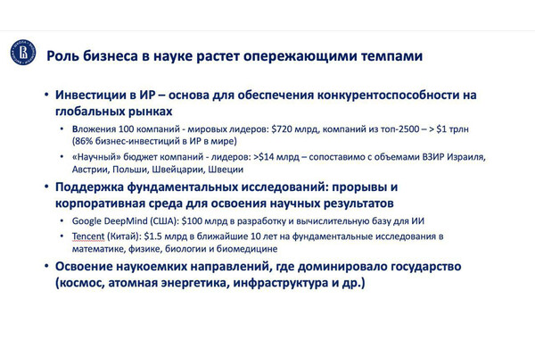 В последние годы значительно усилилась роль бизнеса в развитии науки. Суммарные инвестиции первой сотни мировых лидеров корпоративного сектора в науку уже составляют более 720 млрд долларов. «Научный» бюджет лишь одной компании, входящей в этот пул, в среднем приближается к 14 млрд долларов. Это сопоставимо с внутренними затратами на исследования и разработки стран уровня Израиля, Австрии, Польши.