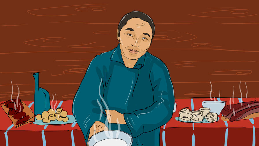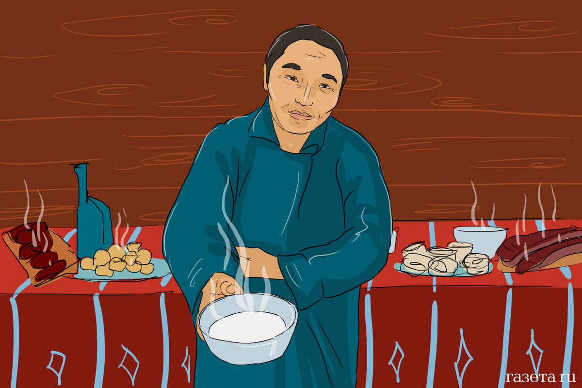 Но главным интересом моей экспедиции была еда, даром что приехал я в компании команды красноярского ресторана Tunguska, искавшего вдохновения для новых меню. И начать аналогичное нашему путешествие надо в заведении под названием «Алдын-Булак» в 40 км от Кызыла. Прекрасно, во-первых, само место – пышно украшенные юрты в ложбине среди сопок на берегу Енисея. На каждой сопке – буддийские, шаманские и даже тенгрийские (религия монголов времен Чингисхана) символы. В одной из юрт – ресторан, в котором кормят классической тывинской едой.