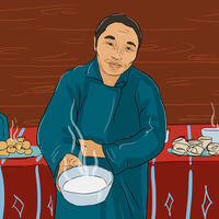 В «Алдын-Булаке» готовят всю тывинскую классику. Во-первых, главный хит, хуужуры – крошечные чебуреки из плотного теста. Начинки бывают двух видов: рубленая говядина с рубленым бараньим курдюком либо мелко перемолотые бараньи потроха. Второй вид, на мой взгляд, даже интереснее, но найти его сложнее. Во-вторых, бууза – так здесь называют буузы, они же позы, они же манты: большие, приготовленные на пару пельмени с отверстием наверху, с начинкой из рубленой баранины. Затем кара мун, то есть «черный бульон» – суп из бараньего мяса и потрохов, с крупой или лапшой. И непременно сюттюг шай, главный напиток всех кочевников Центральной Азии – зеленый плиточный чай, сваренный с молоком и солью. Можно, впрочем, попить чаю, заодно и поев – в чайном бульоне тут частенько подают пельмени.