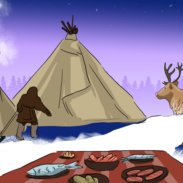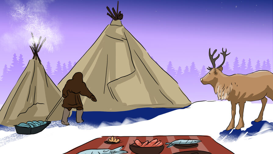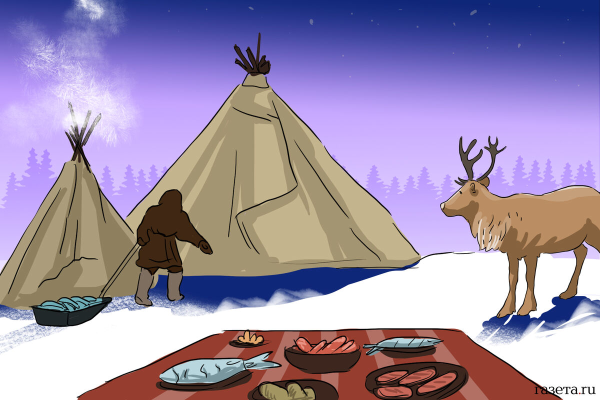 Конечно, оленина всех видов и способов приготовления – сырая, копченая, вяленая, печеная, жареная и в виде юколы. Юкола – особый, исконно таймырский способ заготовки продуктов: высушивание специальным образом надрезанной рыбы и (реже) мяса на сильнейшем арктическом ветру. Продукт практически полностью теряет влагу, буквально дегидрируется – без предварительных надрезов его просто невозможно было бы потом разделать.