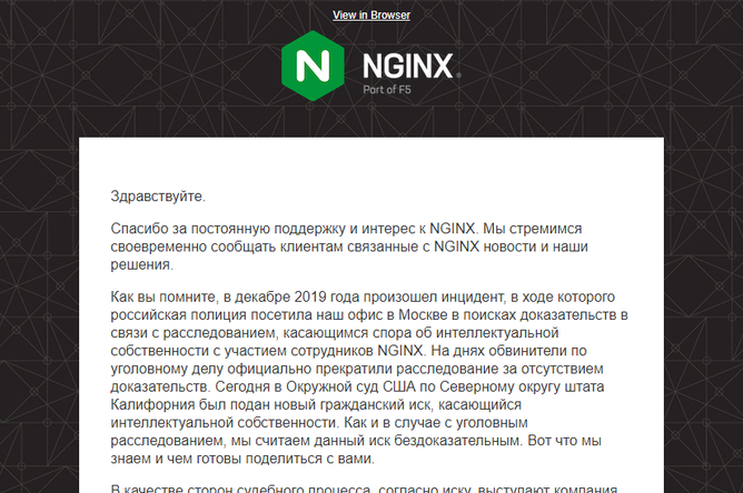 В случае, если в России следствие своевременно не установит истину по делу Nginx, то спор о правах на важнейшую российскую технологию будет отдан полностью на откуп американского суда. И в случае, если в иске Lynwood все же будет отказано, одна из важнейших IT-технологий останется в собственности американской компании F5.