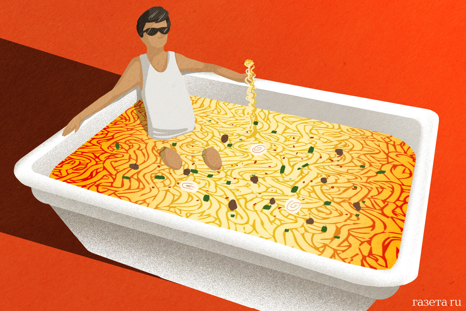Как они не умерли? Это же пустые калории, приправленные едкими специями. По идее «Доширак» должен был уйти в небытие, как страшный сон. Как повод для дурного воспоминания о жутких 90-х. Тогда у нас было три константы потребления: сниженного — пакетики растворимых напитков Yupi, повышенного — чипсы из картонной тубы Pringles и обыкновенного — «Доширак». Помню времена, когда все вокруг ели «Доширак». Покупали детям на ужин. Замачивали его в майонезе и клали в тертую морковь, заправляли чесноком, получалась морковь с «сыром». «Дошираком» поправляли похмелье. Видимо, за счет обилия соли он быстро восстанавливал водно-солевой баланс выпивохи. Почему было просто не хлопнуть стакан соленой воды? Загадка.
