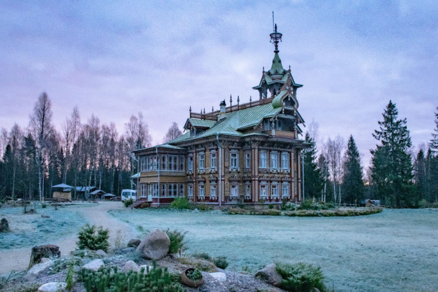 Представьте себе, что едете вы по автостраде, частично уже отремонтированной, иной раз и заново построенной, а иной – только слегка подправленной, по сторонам – русские равнинные просторы, заросшие дикой травой и кустарником, темные леса, редкие деревни, речки со странными названиями. Таков обычный пейзаж Костромской области, одной из самых безлюдных в нашей стране, и чем дальше на север, тем безлюдней. Вся небогатая цивилизация сосредоточена вдоль автострады – бензоколонки, редкие кафе, шиномонтажи. Но стоит съехать с трассы – и уже не встретить никаких следов человеческой деятельности, кроме штабелей с бревнами, подготовленным лесорубами для вывоза, и остатков брошенных деревень с превращенными в развалины храмами. И вот после 30 километров проселочной дороги, заботливо засыпанной крупным гравием, от которого душу вытрясешь, вы вдруг попадаете на сказочную поляну – открытое, дочиста выкошенное пространство с прудами, альпийскими горками, садом-огородом, баней, клумбами и тропками. А посреди поляны – терем с картин Васнецова или Головина – резной, нарядный, разноцветный. В нем вы можете пожить пару дней, если заранее забронировали себе номер, и эта территория с ее лавочками, беседками, расчищенными тропами к озеру, птицами и цветами станет на время вашей.