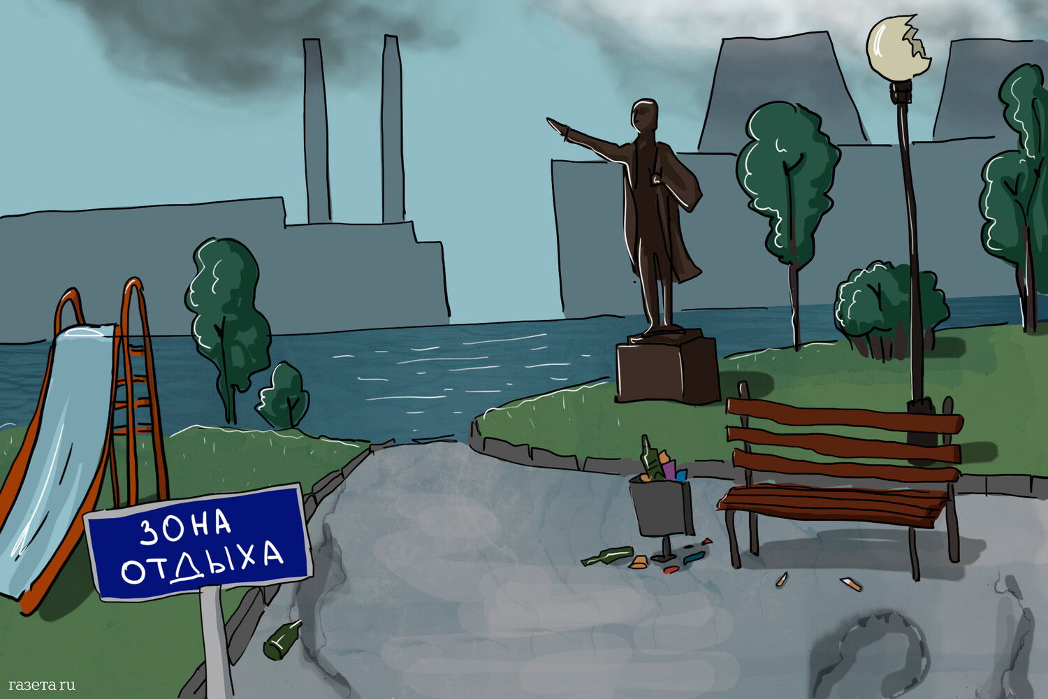 Приехав в Южу туристом этим летом, фонтан и площадь Ленина с детской площадкой я видела. А вот следов облагораживания прибрежной зоны не обнаружила. Перешла через мост, видела разрушенные строения, попыталась пробраться поближе к берегу озера – не смогла, все заросло травой в рост человека. Оказалось, что я просто не с той стороны заходила. Благоустроено в другом месте, там и дорожки, и светильники (правда, в газетах писали, что часть украли еще в процессе установки, а они дорогие, ну и кое-что из деревянных конструкций тоже вандалы попортили, собственные вандалы, местные).