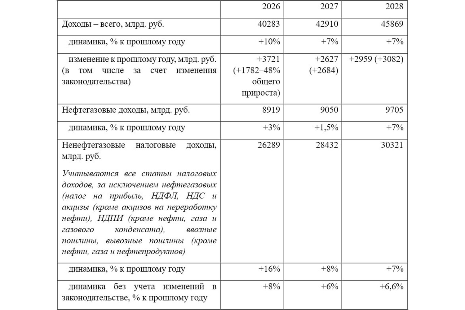 Министерство финансов РФПредполагается, что доходы федерального бюджета вырастут в 2026 г. на +10% год к году с замедлением динамики до +7% в 2027-2028 гг., для региональных бюджетов прирост составит +5–8% в год (собственные доходы), для внебюджетных фондов - +13% в 2026 г. и +7-8% в 2027–2028 гг. (собственные доходы).