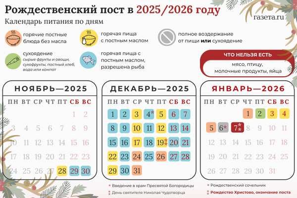 В 2025–2026 году Рождественский пост у православных начинается в пятницу, 28 ноября 2025 года, и закончится в Рождественский сочельник, 6 января 2026 года.
