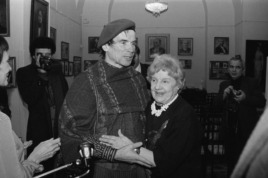 Балетный танцовщик Рудольф Нуреев и народная артистка СССР, балерина и педагог Наталья Дудинская во время встречи в Ленинградском академическом хореографическом училище имени А. Я. Вагановой, 1989 год