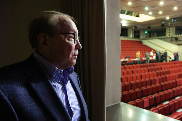 Телеведущий Александр Масляков во время интервью информационному агентству ТАСС в театре «Планета КВН», 2021 год