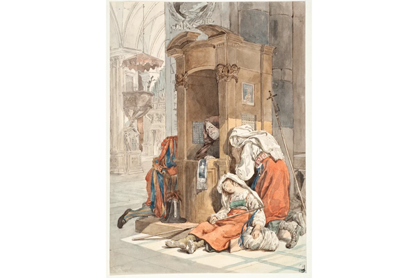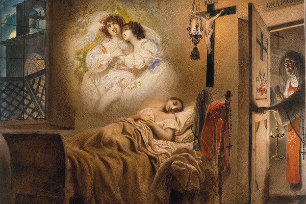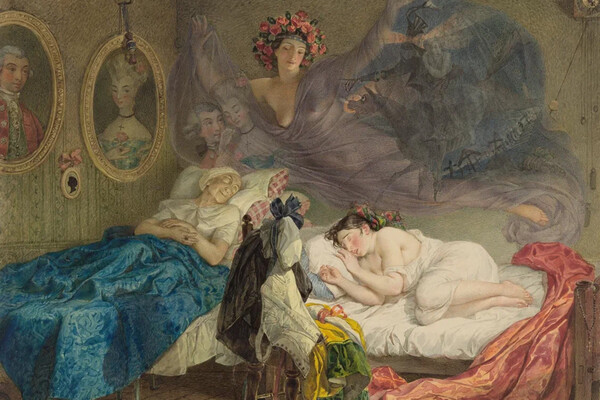 Есть среди акварелей Брюллова и ироничные фантазии, изобразительные новеллы, в которых художник выступает как рассказчик забавной истории. Таковы, например, его «Сны»: «Сон Бабушки и внучки» и «Сон монашенки».