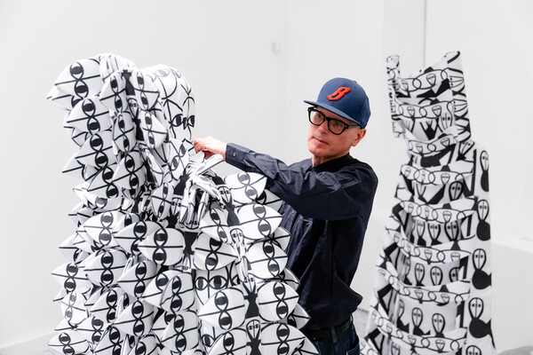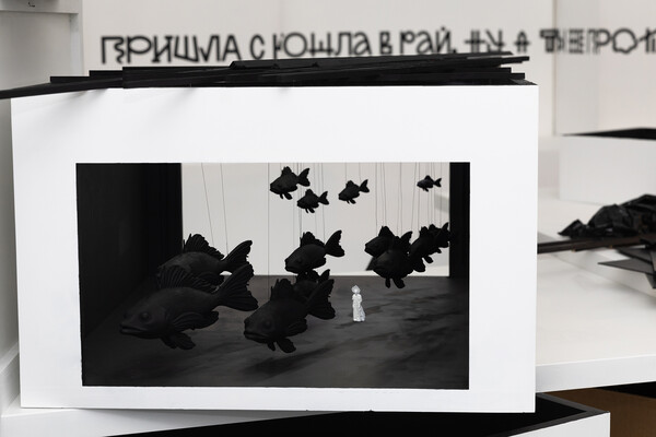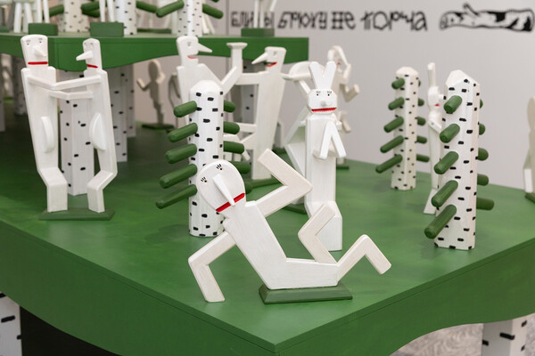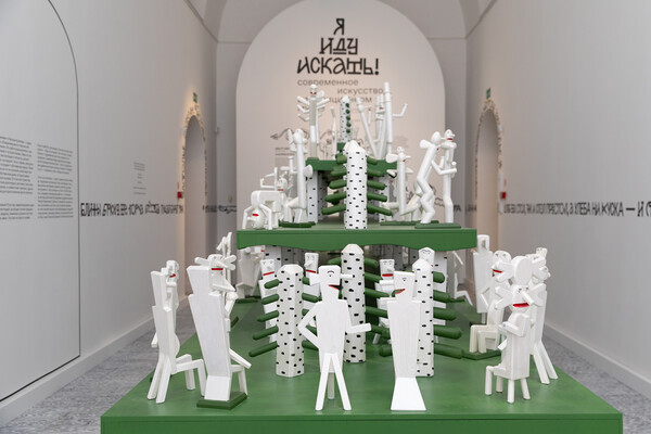 Важно, что именно в этом зале располагаются и деревянные скульптуры представителя наивного искусства Владимира Зазнобина — «Гармонист» и «Певица» из коллекции музея-заповедника «Царицыно». Они будто вступают в диалог с работами современных художников и становятся участниками разворачивающегося на наших глазах масштабного праздника.