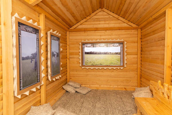 Особую силу обретают ритуальные практики в зале «Проводы». Инсталляция Ульяны Подкорытовой — изба с цифровыми окнами, в которых видим снятый специально для выставки фильм, — рассказывает нам о предсвадебном ритуале. Эти проводы — не в последний путь, а замуж. Но в каком-то смысле это очень схожие в народном видении темы, ведь данные ритуалы крутятся вокруг «умирания». В одном случае — физического, а в случае с проводами — метафизического: умирания девичьей ипостаси. Из девушки рождается женщина.