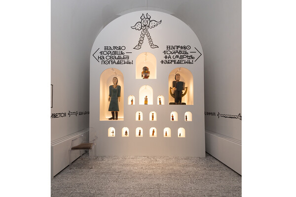 Пространство выставки выстроено как ритуальный сказочный маршрут — ни одному герою не удавалось избежать перепутья и выбора. Не удается это и человеку на протяжении всей жизни. От застолья расходятся два символических маршрута. Правая ветвь посвящена циклическим переходам, которые человек не властен изменить. И тут снова уместно вспомнить, как принято было в народе провожать одно и встречать другое время года. Мы и сегодня повторяем эти обряды, сжигая чучело Зимы на Масленицу или радуемся урожаю на Яблочный спас. Все это отголоски традиционных ритуалов в нашей культуре.