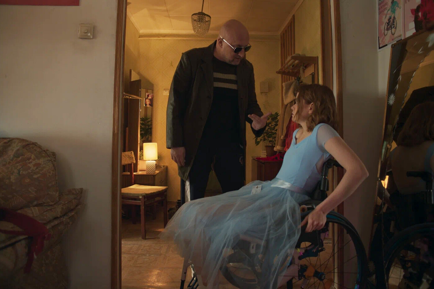 Причем на плечи Никитина здесь возложен тяжелейший груз: миссия его персонажа, хамоватого таксиста в спортивном костюмчике, состоит в том, чтобы продемонстрировать, как пренебрежительным отношением к людям с инвалидностью, принятом в социуме, заражаются даже сами люди с инвалидностью. В одной сцене он обрушивает поток слюров на персонажа Санкевича — сотрудника небольшой кофейни, в другой — отмахивается от героини Ершовой и отказывается ее подвозить, не желая утруждать себя погрузкой коляски. Эти довольно тяжелые для восприятия эпизоды слегка сглаживает юмор, вшитый уже в само кастинговое решение: Никитин прежде играл таксиста в другом сериале местного шоураннера Александра Носкова «Капельник», так что отчасти его возникновение происходит в рамках камео. Другая шутка такого рода поручена Святославу Рогожану — всамделишному мужу артистки Ершовой (они встретились на съемках сериала «Трудные подростки»), который тут изображает уступающего претендента на сердце ее героини.