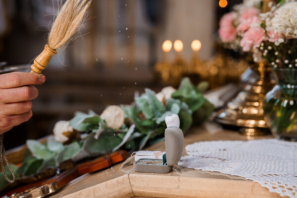 - Обряд обручения. В притворе храма священник выносит крест и Евангелие, затем дьякон приносит кольца на подносе. Каждому обручающемуся он трижды надевает кольцо на безымянный палец правой руки под слова молитвы.