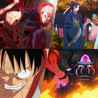 «Монолог фармацевта» «Ван Пис»«Ванпанчмен»«Поднятие уровня в одиночку» «Истребитель демонов»«Магическая битва» «Дандадан» «Кайдзю №8» «Моя геройская академия» «Гачиакута» «Синяя тюрьма: Блю Лок»«Доктор Стоун» «О моем перерождении в слизь»
