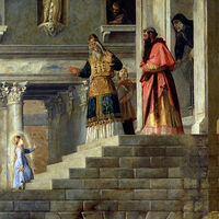 Маленькая Мария, оставив позади мирскую жизнь, без колебаний поднялась по пятнадцати высоким ступеням храма. Согласно преданию, она сделала это самостоятельно, не оглядываясь на родителей, что поразило всех присутствующих. Ее встретил сам первосвященник Захария, будущий отец пророка Иоанна Предтечи.
