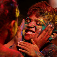 Осыпая друг друга красками, люди желают счастья и процветания. Чем больше разных цветов на человеке, тем больше добрых пожеланий он получил.