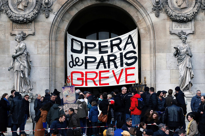 На стенах оперы участники акции повесили транспаранты с надписями «Парижская опера бастует» и «Культура в опасности».