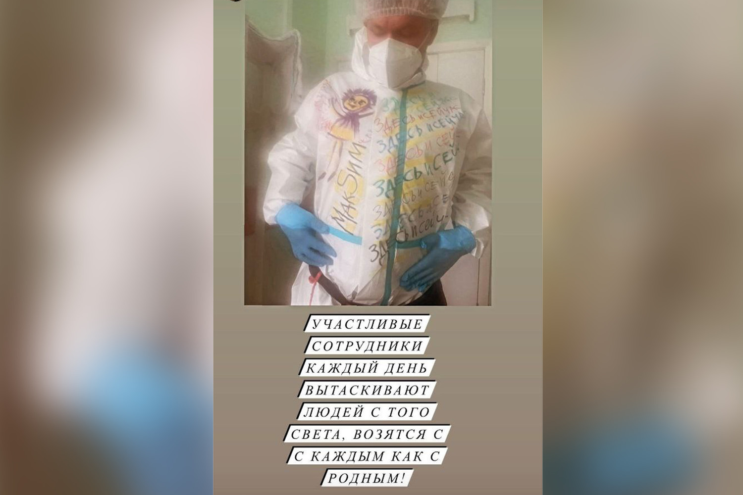 На фотографии запечатлен врач, медбрат или волонтер. На его белом халате много раз написаны слова «здесь и сейчас», а также нарисована улыбающаяся девушка — судя по всему, сама МакSим.